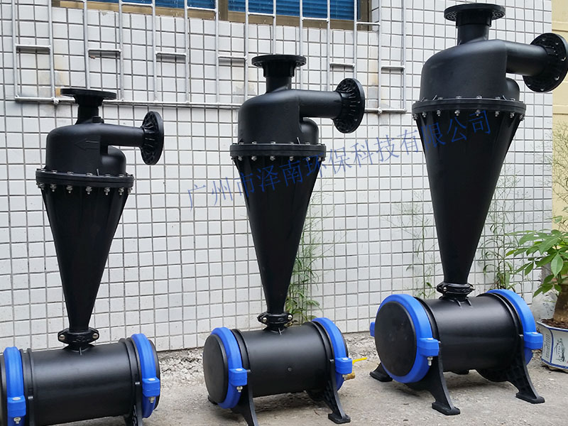 工作原理:离心式过滤器基于重力及离心力的工作原理,清除重于水的固体颗粒。水由进水管切向进入离心过滤器体内,旋转产生离心力,推动泥沙及密度较高的固体颗粒沿管壁流动,形成旋流,使沙子和石块进入集砂罐,净水则顺流沿出水口流出,即完成水砂分离。定期要进行排沙,排沙时间应按水质情况而定。